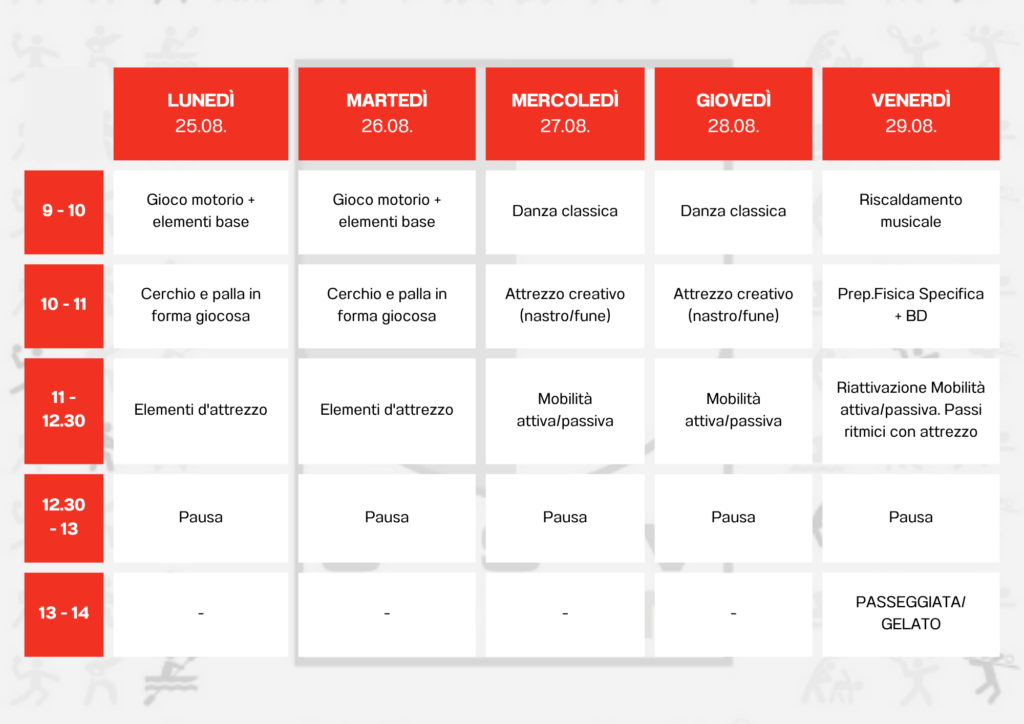 - Per bambine sotto gli 8 anni: programma di mezza giornata con movimento ludico, primi elementi di danza e un approccio agli attrezzi adatto all’età – con tanta gioia e leggerezza.